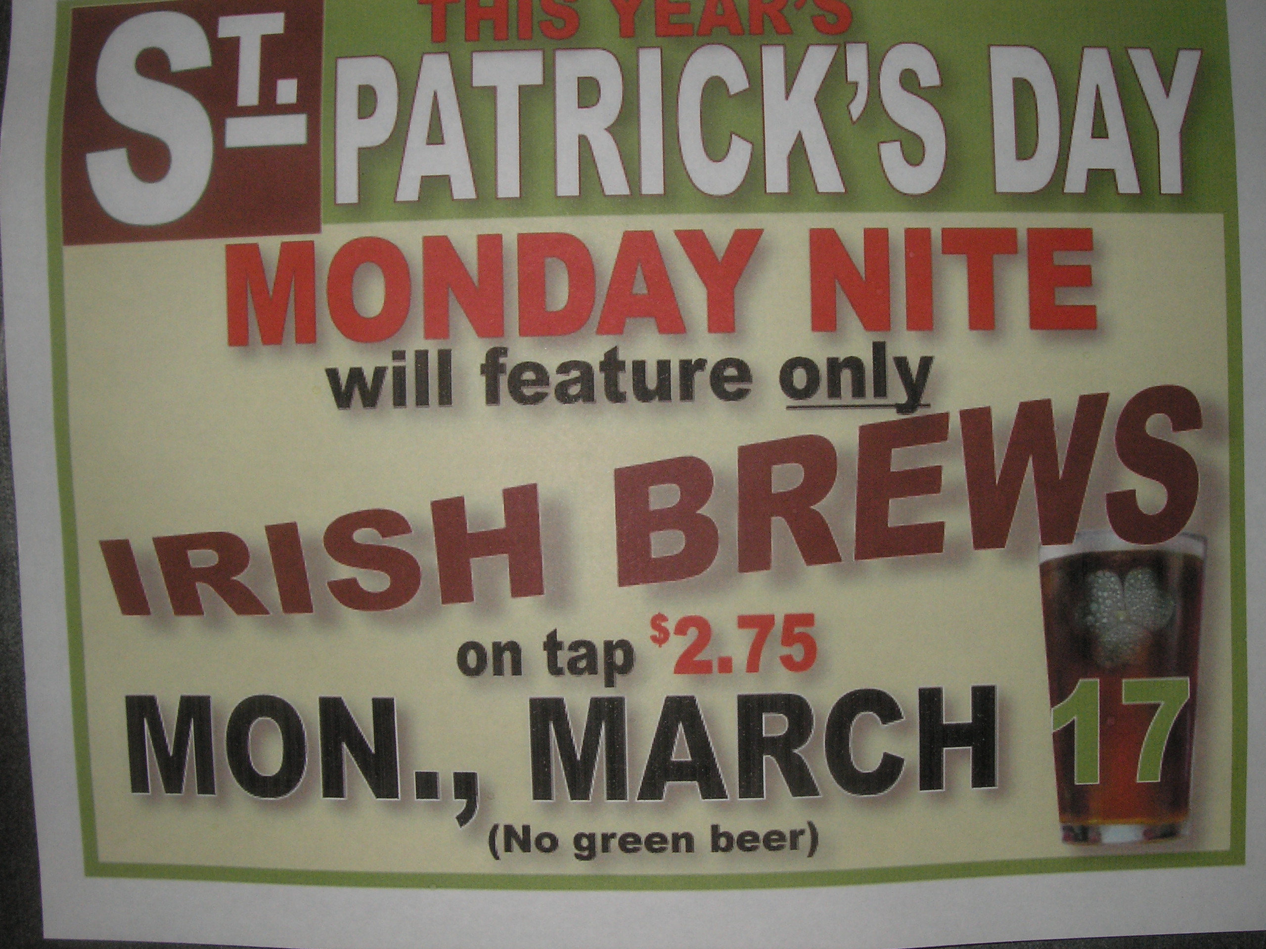 Monday night is St. Patrick’s Day. A big party day. So I looked forward to celebrating it at my favorite bar and then I saw this: