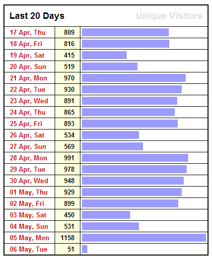 Before I get to my big idea, I have to brag a little… for the first time ever, the blog crossed the 1000-hits-per-day mark yesterday. Here’s what the tracker looked like this morning: