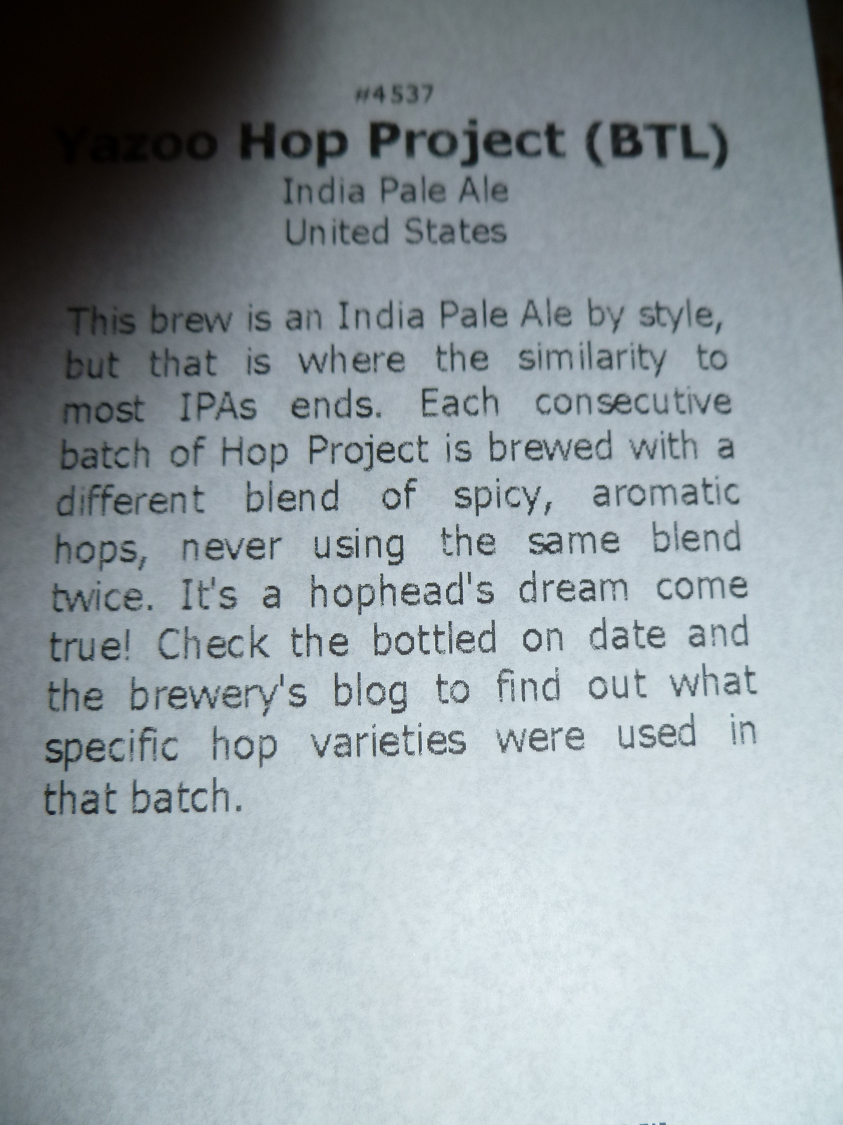 Yazoo Hop Project is a unique beer indeed, a member of the IPA family.