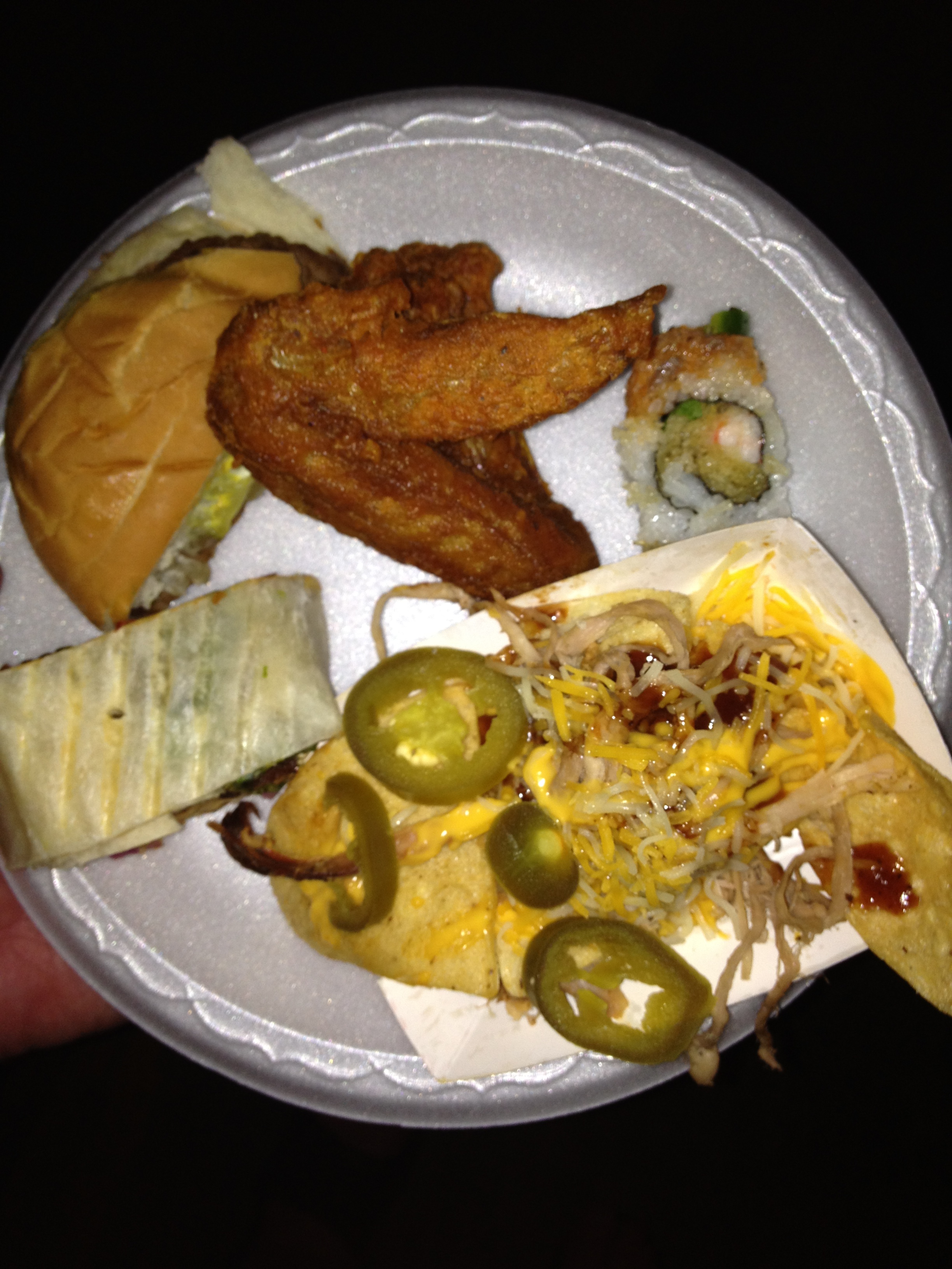 Clockwise, from top: Chicken wing from Gus’s, sushi from Sekisui, BBQ nachos from Central BBQ, black bean roll from Cafe Eclectic, and Soul Burger from Earnestine & Hazel’s. I posted this pic when I checked in on Foursquare, and within a few minutes the Nuh-Uh Girl commented, “Jealous.”