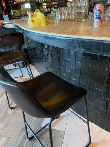 The tiny, wobbly, uncomfortable little bar stools they’ve had at the bar for the past year have been replaced with padded bar seats, with backs, that are wide enough to accommodate a normal-sized human body.