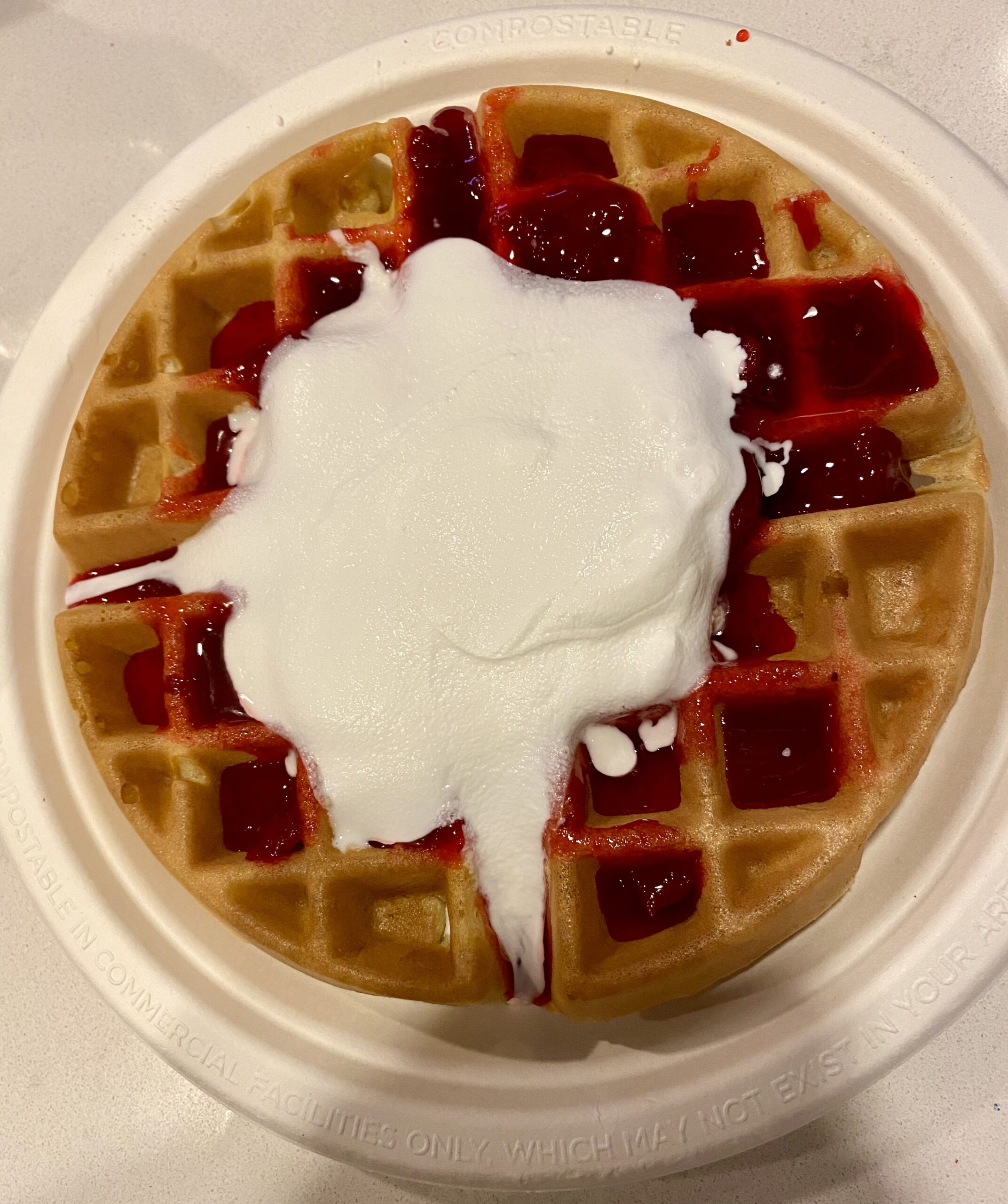 My first-ever make-your-own waffle at the Residence Inn’s hot breakfast buffet. Thanks to the extremely friendly, courteous staff for helping me through the process. After the waffle was done I added strawberries and whipped cream.