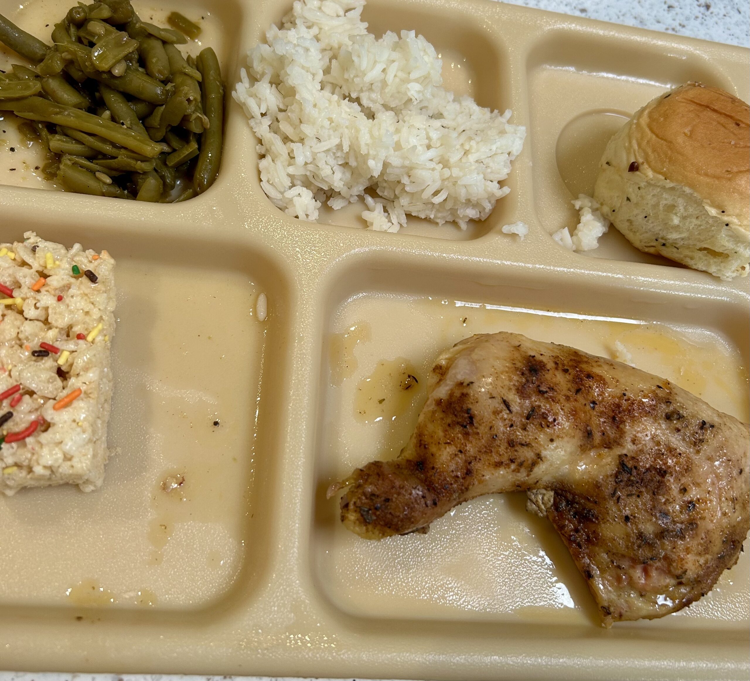 A baked chicken leg quarter, dinner roll, rice, green beans, and a Rice Krispy treat for dessert. As you can see, even an “average” meal at the Mission is a step above what you’d find at a soup kitchen. My only complaint would be that the portion sizes are a bit small. Overall, though, I’m very thankful for dinners like this one.