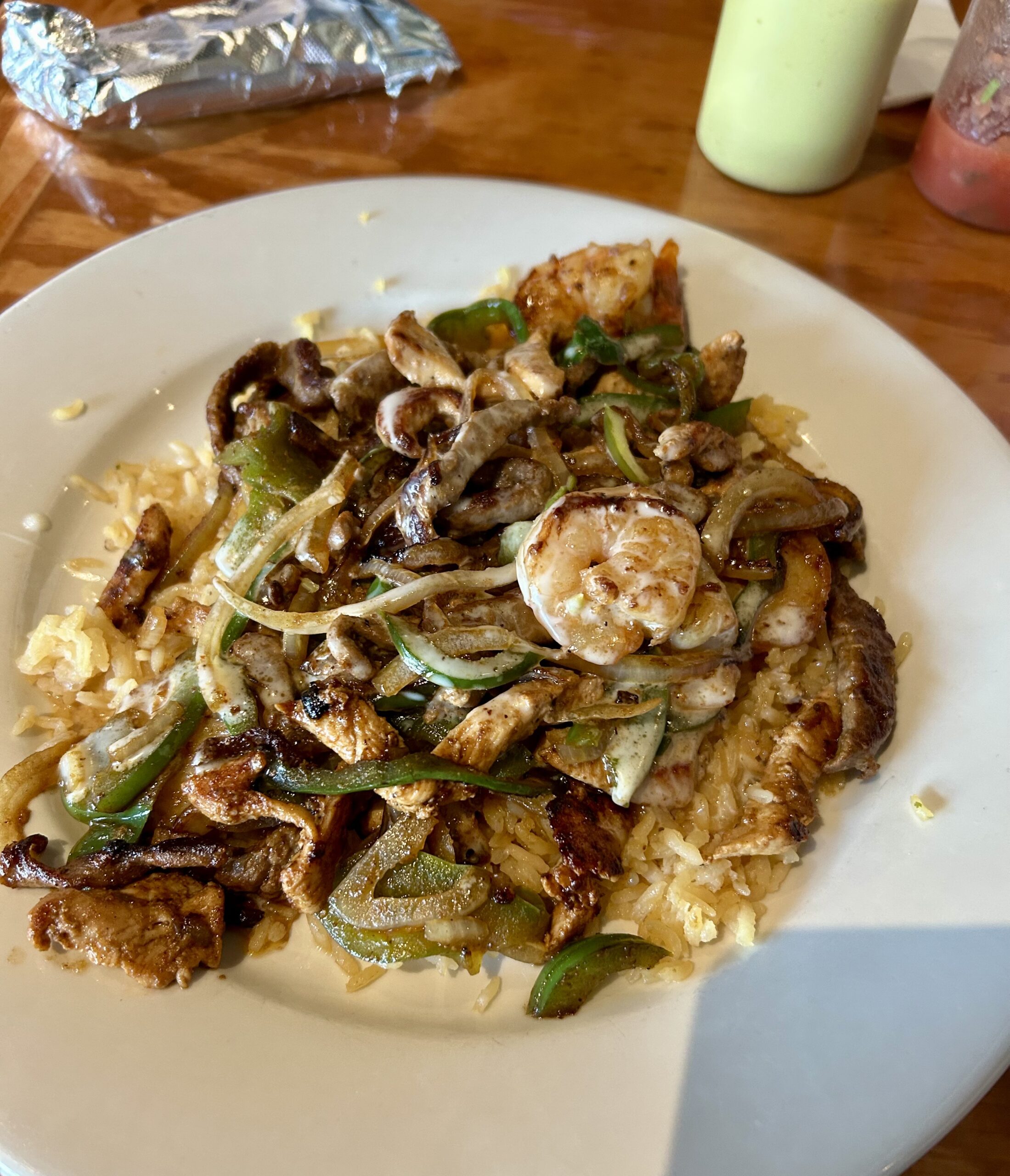 One of their lunch dishes, the Rice Comales, sounded like it was exactly what I was in the mood for. It was a base of rice covered with queso and a choice of fajita meat – pollo, carne asada, or camerones. I chose “mixtos” – a little of each.