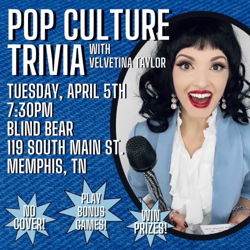 Pop culture trivia with Velvetina debuts at the Blind Bear tonight at 7:30. It’s free to play and you can win Blind Bear gift card prizes.