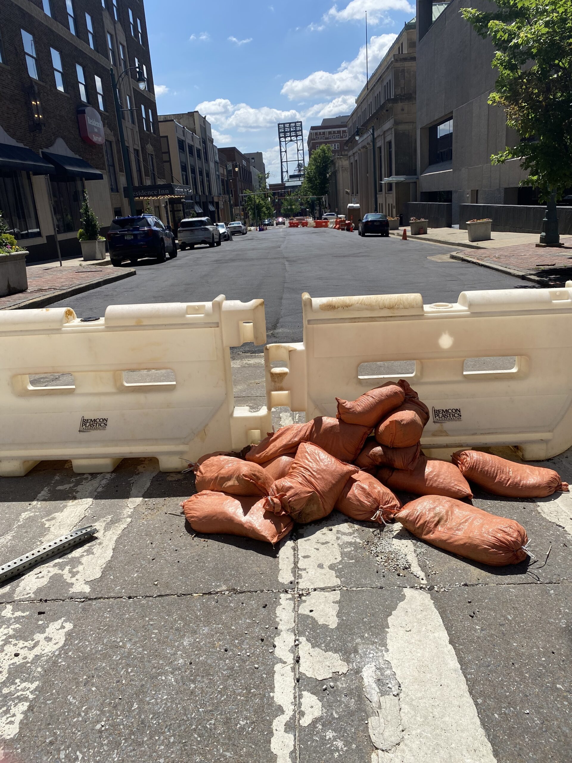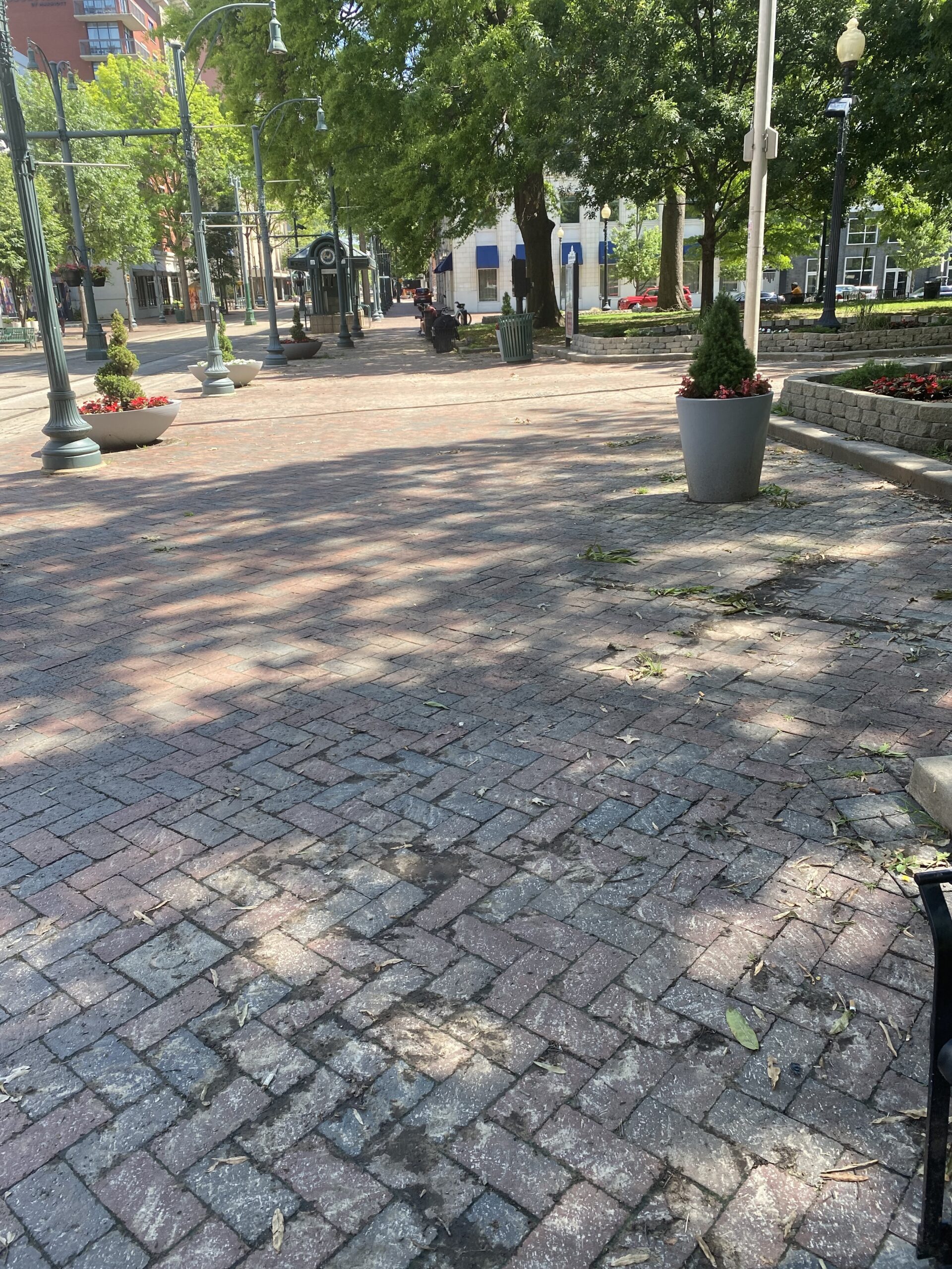 This is the entrance to Court Square, across Main from the Moxy & Springhill Suites parking lot. Notice anything missing?