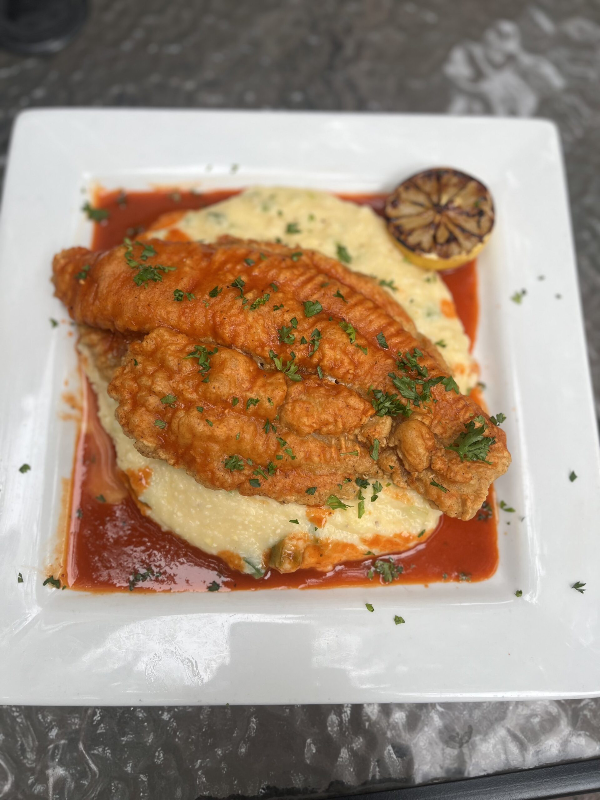 The buffalo fried catfish over jalapeno cheese grits has made it onto the special board at Local on Main for a third day. They also have a chicken breast, grilled or fried, with two sides.