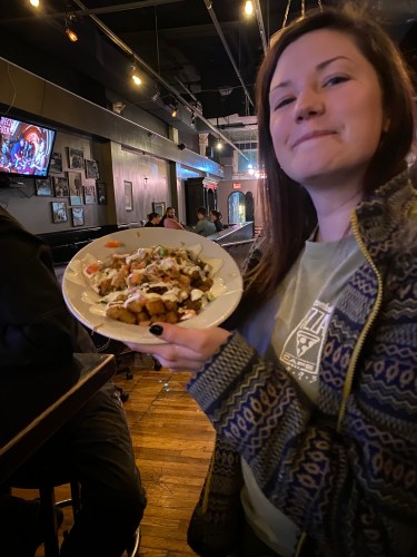 This is the Hibernation Okra she ordered Friday at Blind Bear. All the toppings they put on Hibernation Fries but with okra instead.